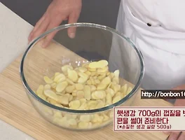 mbn 알토랑 초가을 보양밥상 351회 총각김치 단호박조림 동그랑땡 난자완스 알토란 이종임의 갓김치 황금레시피 갓 1단(2.5kg), 천일염 1컵, 쪽파 150g, 통깨 1 큰 술 양념 : 배 반 개(250g), 양파 반 개(100g), 무 100g, 멸치액젓 5 큰 술, 새우젓 2 큰 술, 고춧가루 2컵, 다진 마늘 10 큰 술, 다진 생강 반 작은 술, 찹쌀풀 약1컵 반, 설탕 5 큰 술 1. 갓 1단(2.5kg)은 깨끗하게 씻어 물기를 제거해 준비한다. 2. 물 10컵(2L)에 천일염 1컵을 넣고 녹인 소금물에 갓을 넣고 총 2시간 절인다. 절이는 중간에 한 번 뒤집어 준다. 절인 갓은 한번 씻어 물기를 빼 준비한다. 3. 믹서에 배 반 개(250g), 양파 반 개(100g), 멸치액젓 5 큰 술,..